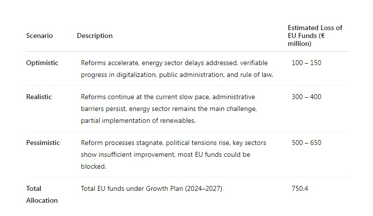 In this scenario, reform processes stagnate, political tensions rise, and key sectors—including energy, rule of law, public administration and economic competitiveness, show insufficient improvement. The EU may suspend most of the planned funds, and the financial risk could reach €500–650 million. This scenario would have severe consequences for macroeconomic stability, the pace of the green transition and the perception of international investors.