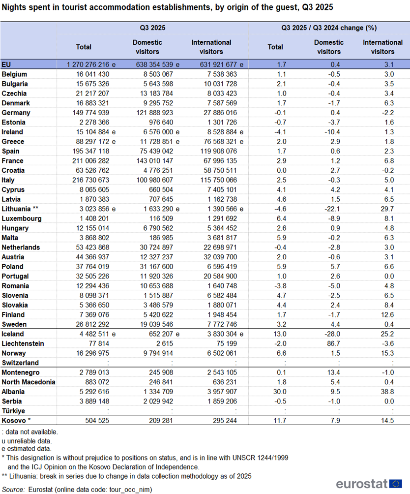 Despite a decline in domestic tourism, Slovenia achieved robust overall growth driven by foreign visitors. Its international growth rate (+6.5%) is nearly four times the EU average and more than 16 times higher than North Macedonia’s (+0.4%).